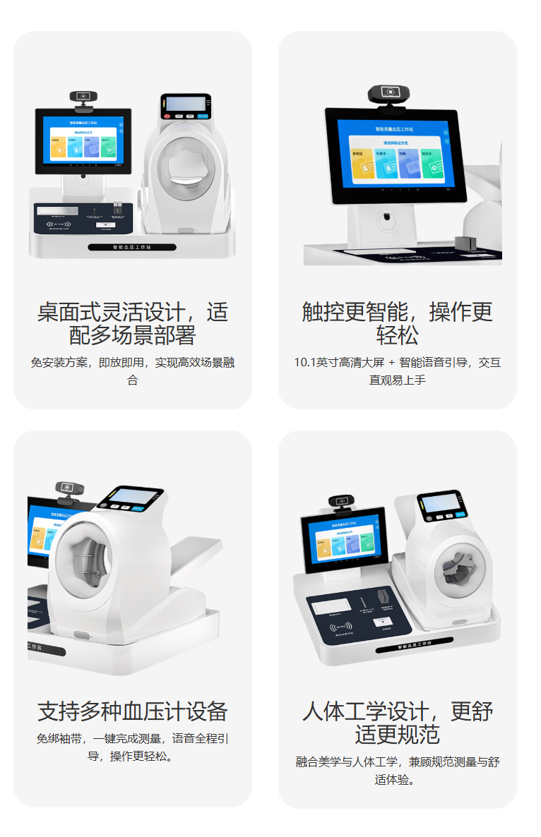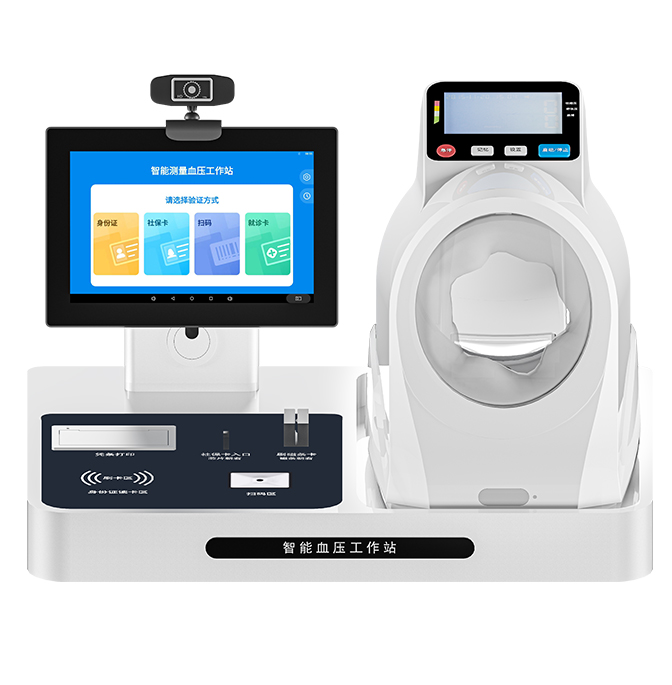 品牌名称:普瑞森 产品名称:智能血压测量工作站 产品型号:PRS-X1X 尺寸:55.7*43*32cm 标配功能:舒张压、收缩压、脉率 拓展功能:血氧、体温 屏幕尺寸:10.1寸高清触摸屏(屏幕可旋转,横竖切换) 登记方式:身份证、人脸识别、医保卡、IC卡、ID卡、条形码、二维码、磁条 可对接:医院HIS系统、电子病历系统、公卫系统、慢病管理平台。 适用场景